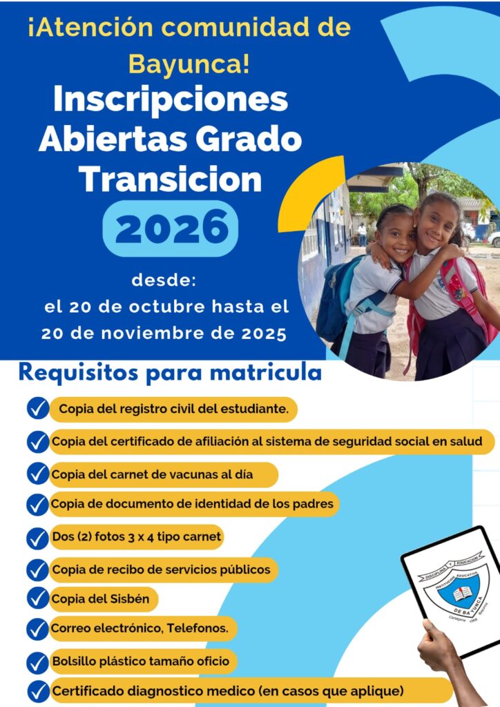 ¡ATENCION COMUNIDAD DE BAYUNCA!se encuentran abiertas las inscripciones para grado transicion periodo 2026